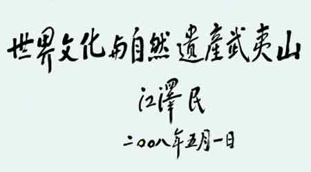 台海网5月7日讯 (福建日报记者 兰锋) 4月24日至5月7日,江泽民同志在我省考察。5月1日在武夷山考察时,他高度评价了武夷山深厚的文化底蕴和优美的自然风光,欣然题词:“世界文化与自然遗产武夷山”,并赋诗一首,赞美武夷山,全诗如下: