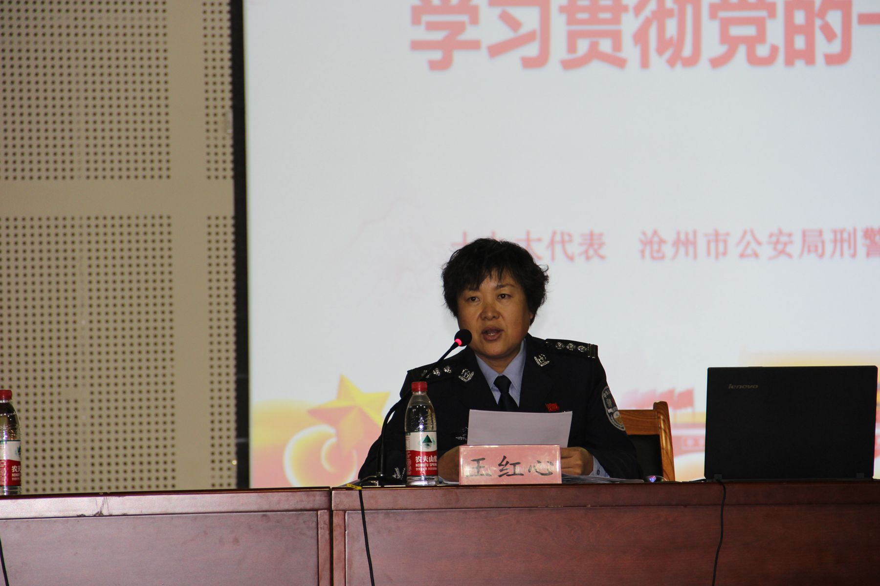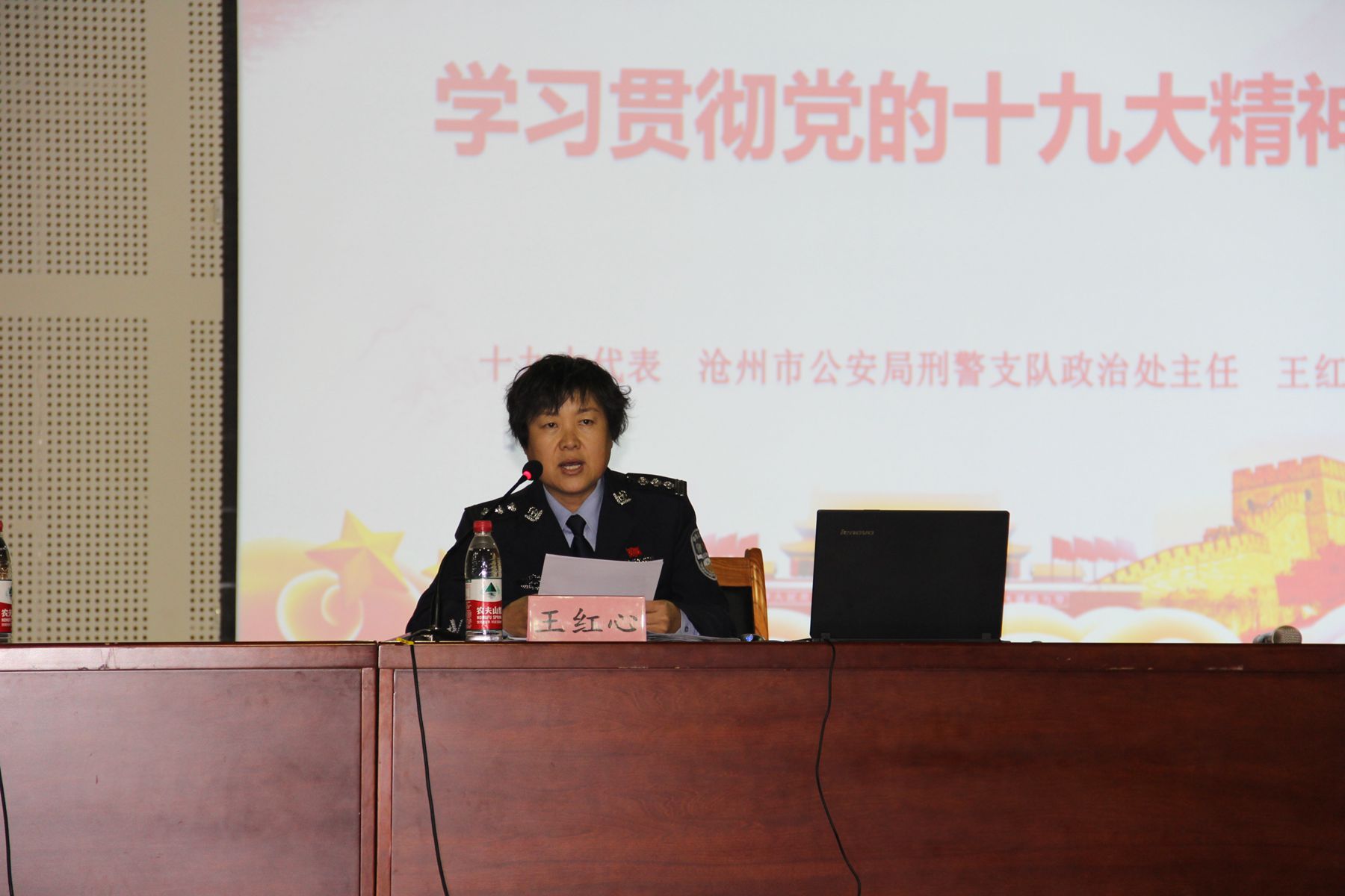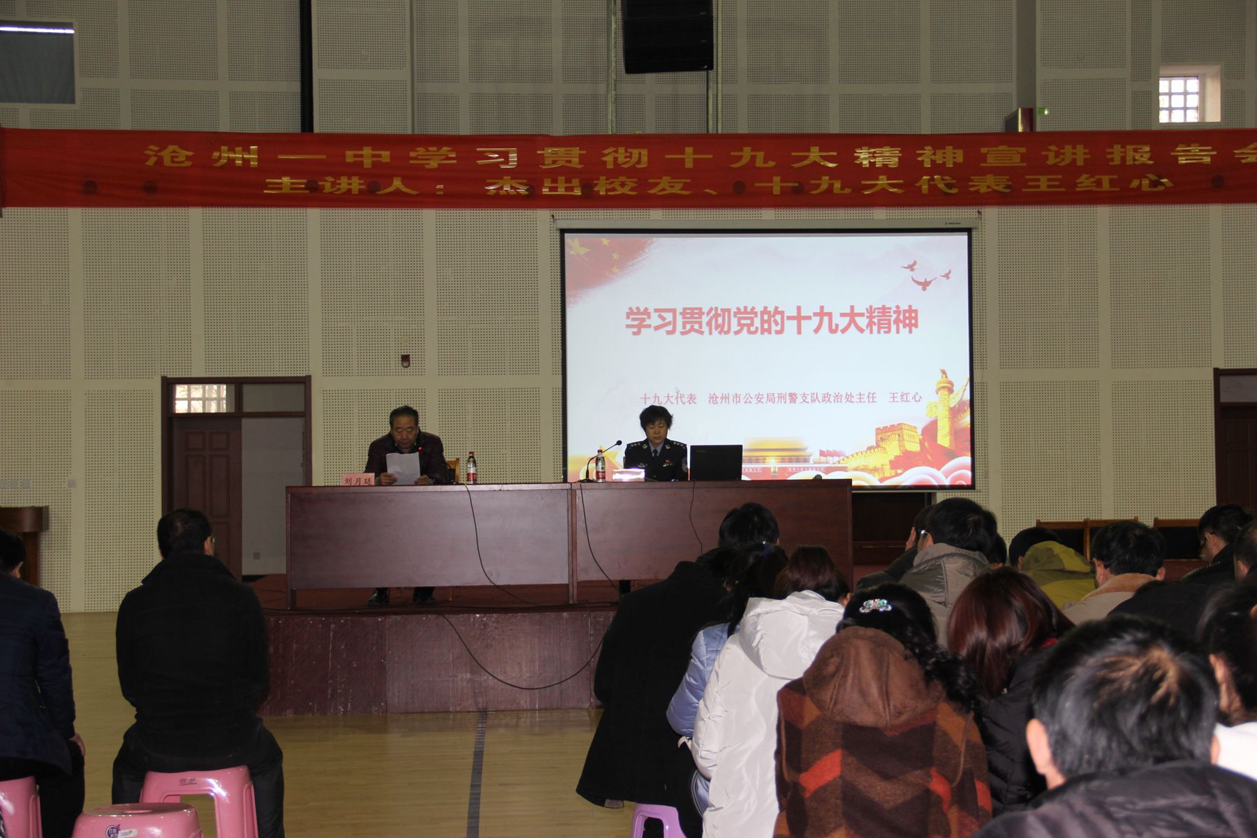 11月22日下午,我校在体育馆组织召开了“沧州一中学习贯彻党的十九大精神宣讲报告会”。邀请党的十九大代表、沧州市公安局刑警支队政治处主任、杰出校友王红心来母校宣讲十九大精神。我校400多名教职工出席了会议。会议由校长刘月廷主持。