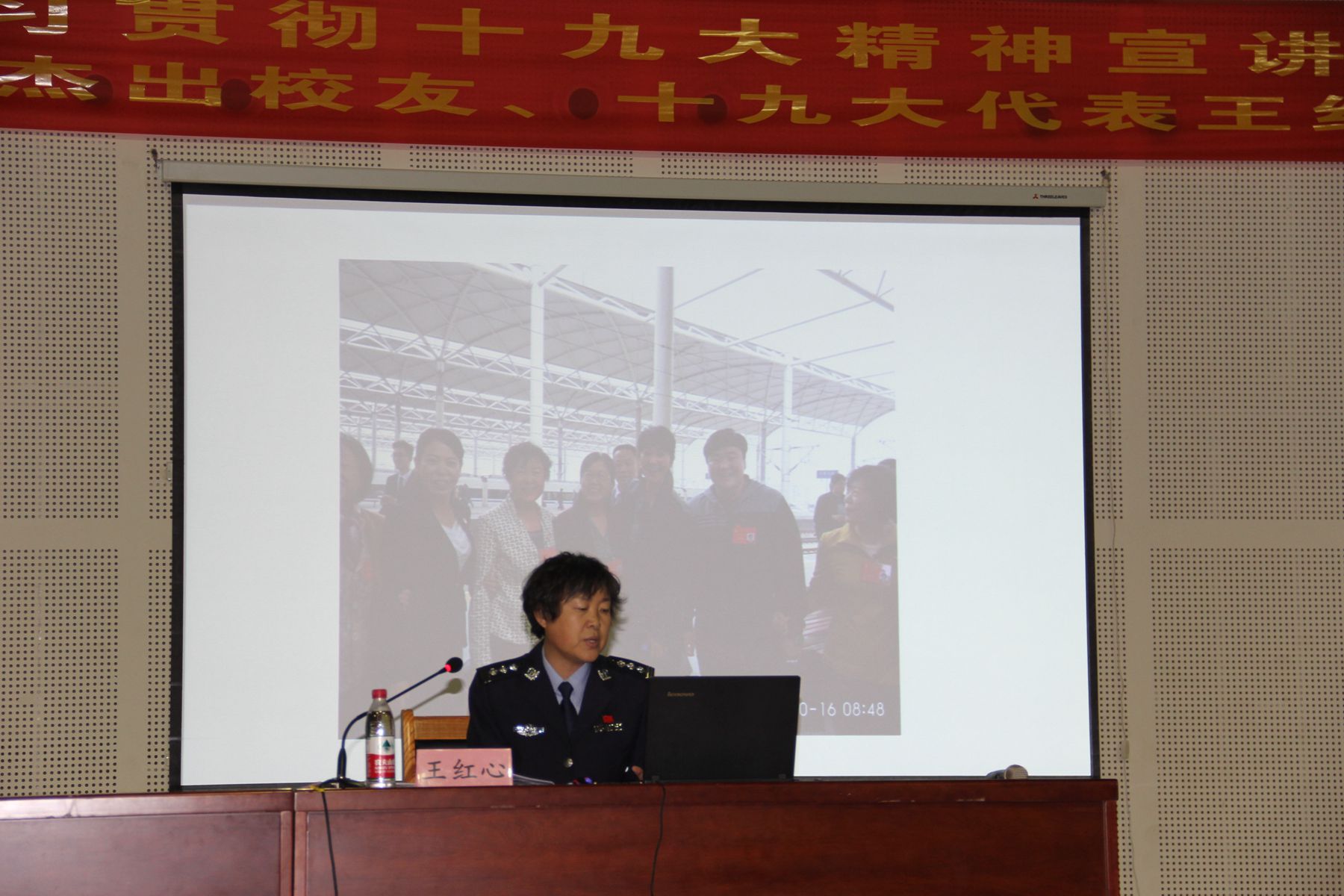在宣讲报告中,王红心首先和母校老师们共同分享了自己所在的河北代表团出席十九大的感想与体会。她从代表通道、分团讨论、媒体采访、会后工作等方面介绍了“十九大”召开情况。她说,十九大呈现出节俭办会、求真务实、开放自信、彰显团结奋进等九个显著特点。她还兴致勃勃地和大家分享了十九大的一些精彩瞬间,展示了十九大代表们的精神风采。