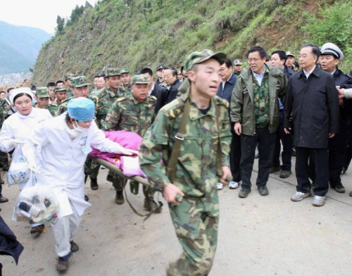 温家宝14日上午在四川北川县察看受灾情况时对受灾群众说,已经派出了解放军、武警官兵、公安民警总计达到十万人,到每一个县、乡、村实施救援工作。为了抓紧最宝贵的救命时间,14日13时30分,总参谋部决定再紧急增派32000名官兵驰援四川灾区。作为国家救灾总指挥,温家宝以及从中央到四川各级党政军方方面面的官员彻夜未眠,坚持在地震第一线,千千万万专业救灾人员不顾安危,艰难奋斗在废墟和灾区中。人们深深感受到举国一致、同心同德的民族魂。人民解放军的形象,从上世纪80年代末后,经历华东水灾、非典、今年春节前后的南方冰冻雪灾,到今次的抗震救灾,一再谱写出救国救民的英雄曲!