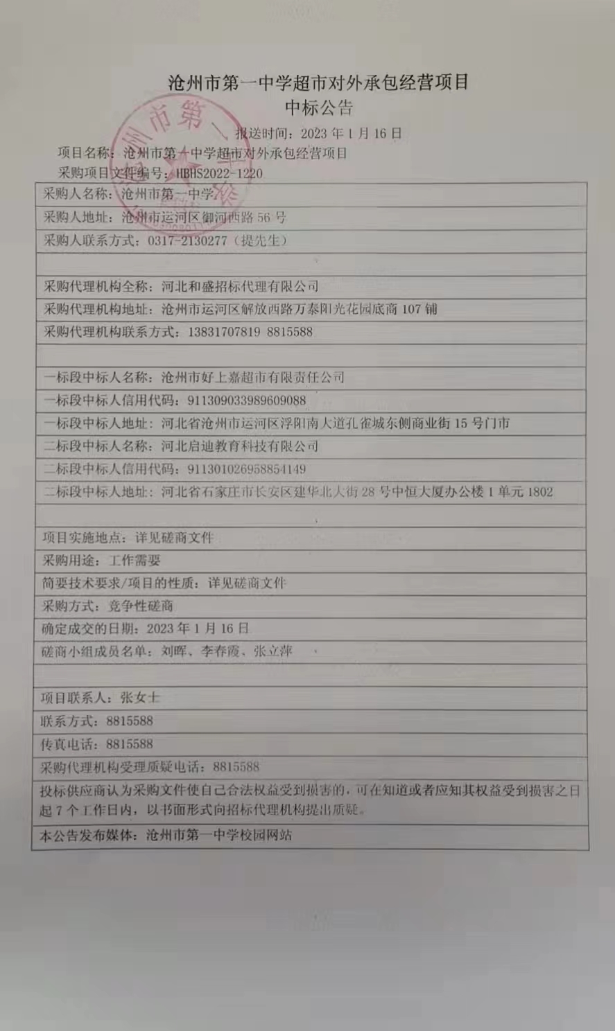 • 沧州市第一中学超市对外承包经营项目竞争性磋商公告2023-01-05 10:38
