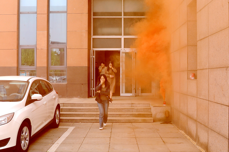 演练开始前,安全处主任李猛讲解了疏散流程及注意事项。演练开始后,老师们以最低的身体姿态快速前进,分东西疏散通道跑下楼至体育馆门口,集合清点人数。随后,全体教师进行了灭火器、过滤式自救呼吸器、消防水带的实操演练。
