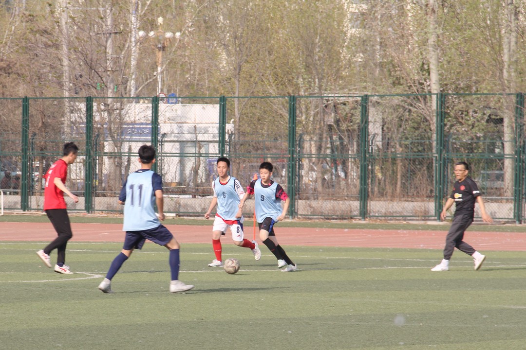 首场是师生友谊赛,球员们迅速进入状态,在绿茵场上奔跑、穿行。