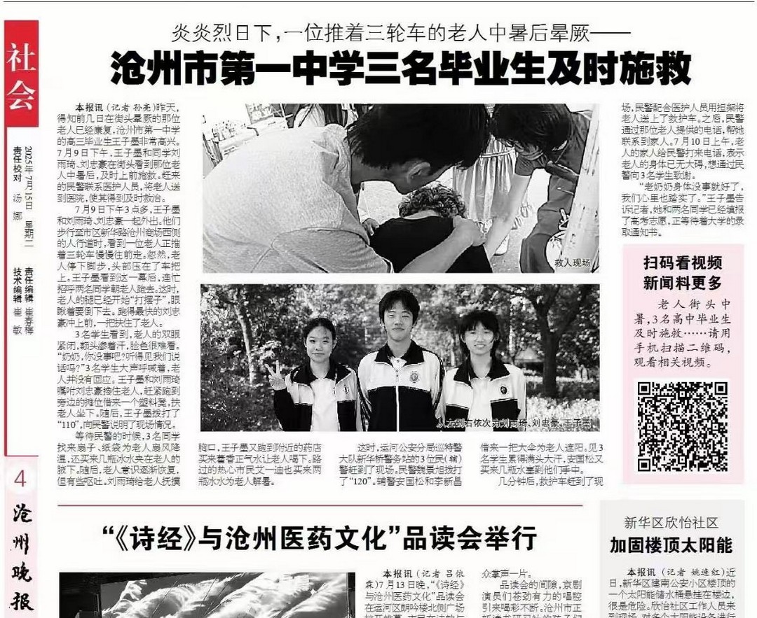 日前,沧州各媒体争相报道我校三名高三毕业生街头勇救中暑老人的事迹,引发全城点赞!