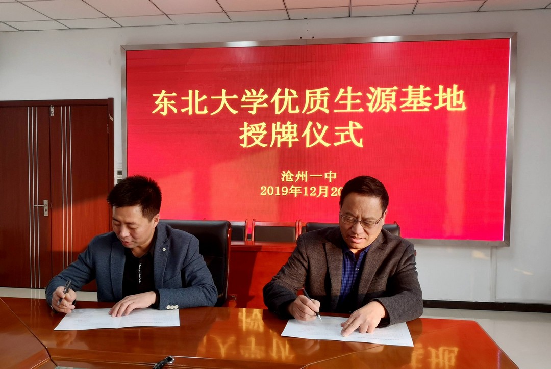 仪式上,我校副校长顾新立致辞并简要介绍了我校的基本情况。东北大学产业集团党委副书记、河北招生组组长孟庆旺向与会人员介绍了东北大学的基本情况,并代表东北大学与我校签订了战略合作协议,向我校授予了“优秀生源基地”牌匾,副校长顾新立代表我校接受授予。