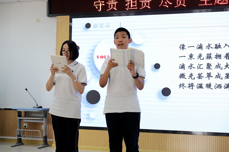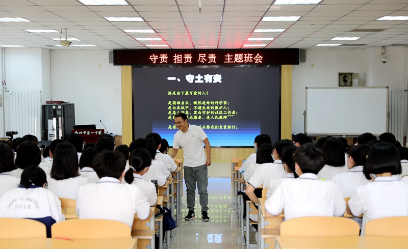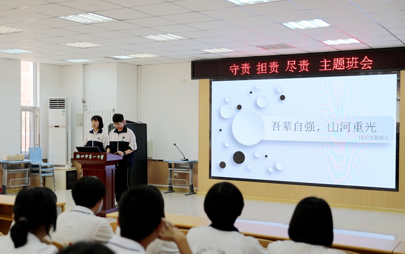 班会在同学们起立诵读中落幕,在齐诵词中写到:“我所在的地方,就是我的中国,我有光明,中国就不会黑暗。我所在的地方,就是我的家乡,我守土担责,家乡就不会荒凉。我所在的地方,就是我的一中,我守土担责,一中就不会蹒跚。我所在的地方,就是我的班级,我守土担责,人人定创造辉煌。”