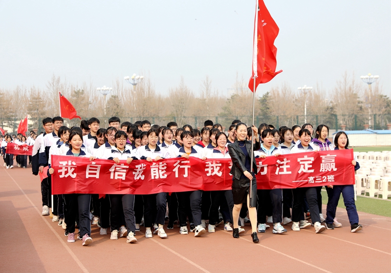战旗猎猎,锣鼓喧天。2点30分,高三年级师生排着整齐的队伍,意气风发地走入会场。嘹亮的口号声,顿时响彻美丽的校园。