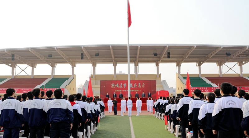 会议举行了庄严的升旗仪式。全体师生肃立,面向飘扬的五星红旗,高唱国歌。嘹亮的国歌唱出了全体师生心中的激情。面对祖国的召唤,面对师长的期盼,师生决心在备战高考的道路上,一往无前、奋进拼搏。
